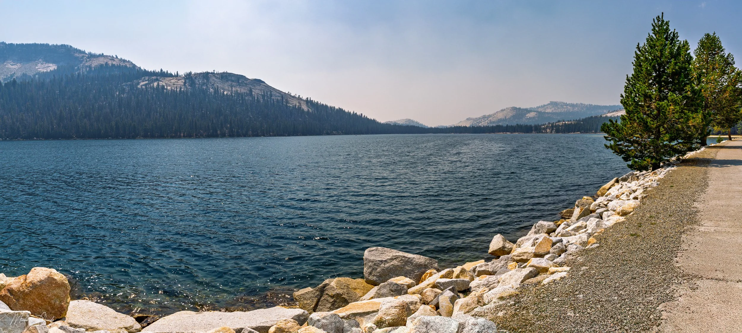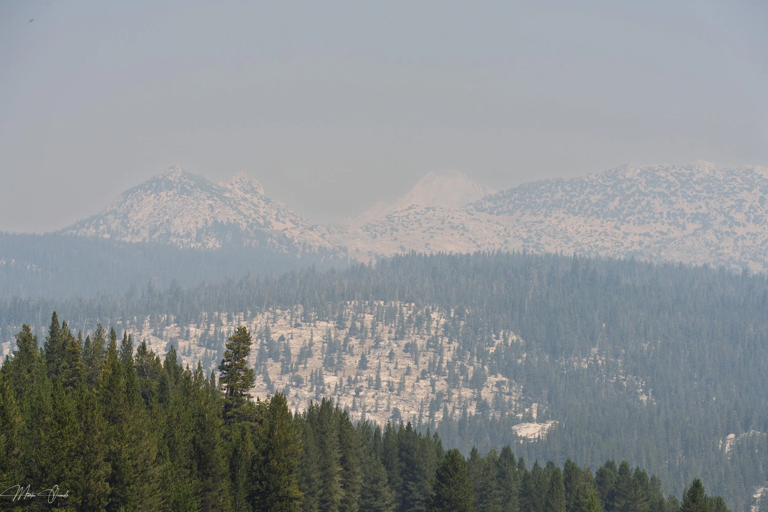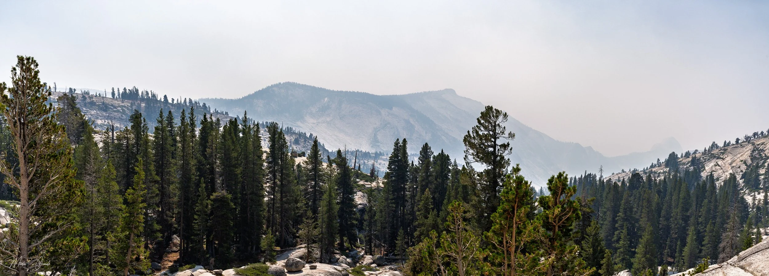 Wildfires were mostly extinguished, but there was still a lot of smoke in the air. Especially for the areas surrounding Tioga Road. The first stop was Olmsted Point, and the next image has been heavily edited with the dehaze slider in Lightroom. It was almost unusable due to the thick smoke cover.